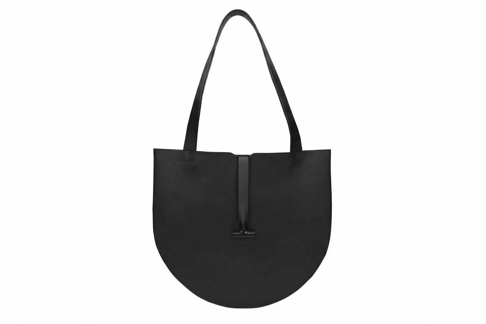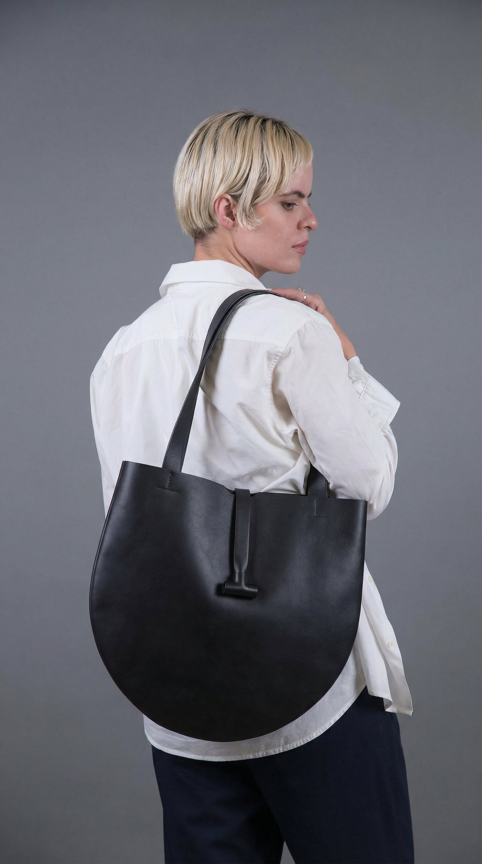 Bolsa redonda en cuero con compartimentos internos para objetos pequeños.