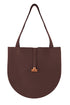 Bolsa redonda en cuero con compartimentos internos para objetos pequeños.