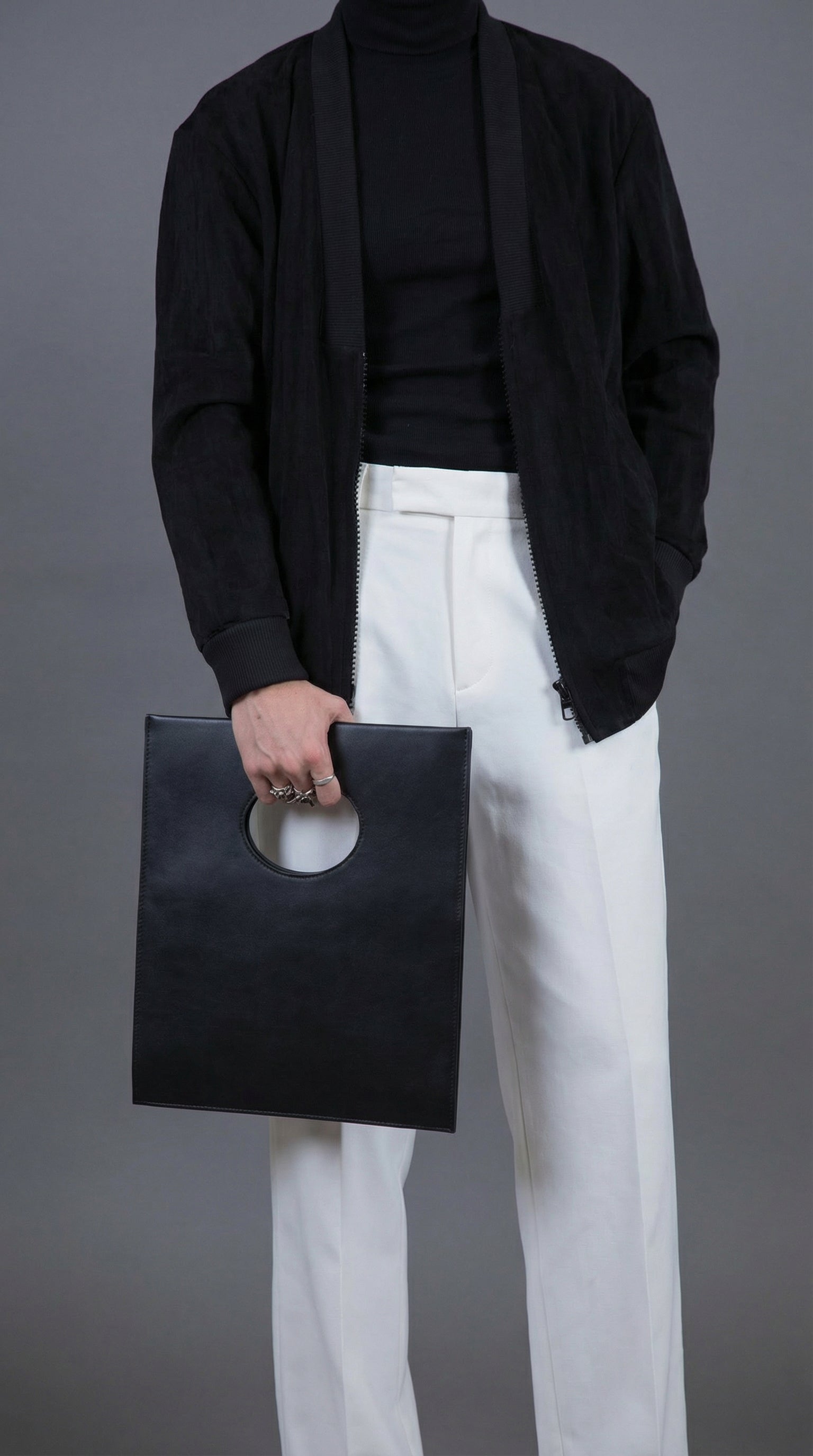 Bolsa de mano cuadrada con zipper interno.